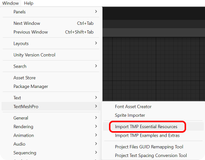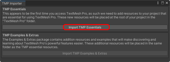 Alternatively, you can use the " *Window / TextMeshPro / Import TMP Essential Resources* " to install it.