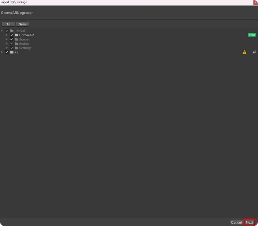 <figure><img src="https://413558230-files.gitbook.io/~/files/v0/b/gitbook-x-prod.appspot.com/o/spaces%2FEtUJA212Zc1S9ACc8T4l%2Fuploads%2FArOZ4GHGtbhnDlzD1xnc%2FConvaiARUpgraderimport_1.png?alt=media&#x26;token=391c7980-d70b-4b26-9212-9beb6509cf31" alt=""><figcaption></figcaption></figure>