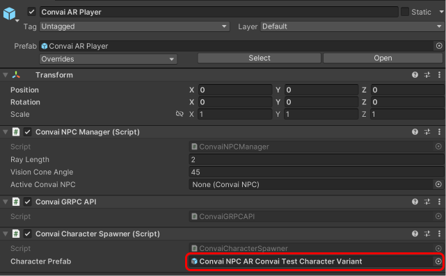 11. In the Inspector, under the " **Convai Character Spawner** " component, add your prefab variant to the **Character Prefab** field.
