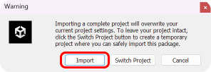 2. You'll see a warning that the settings will overwrite your project settings. You can either allow it by clicking " **Import** " or create a temporary project by clicking " **Switch Project** "