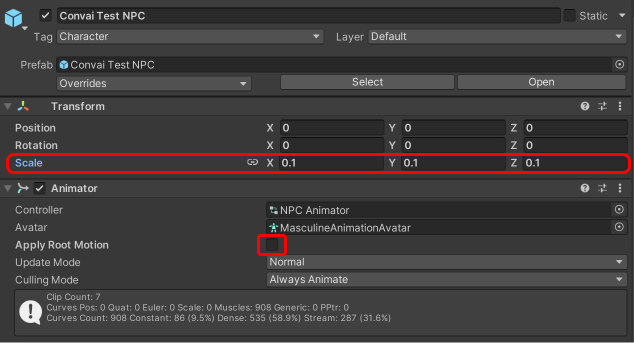 7. In the Inspector, adjust the Scale settings as needed. To prevent your character from moving with animation while talking, disable the " **Apply Root Motion** " option in the Animator.            &#x20;