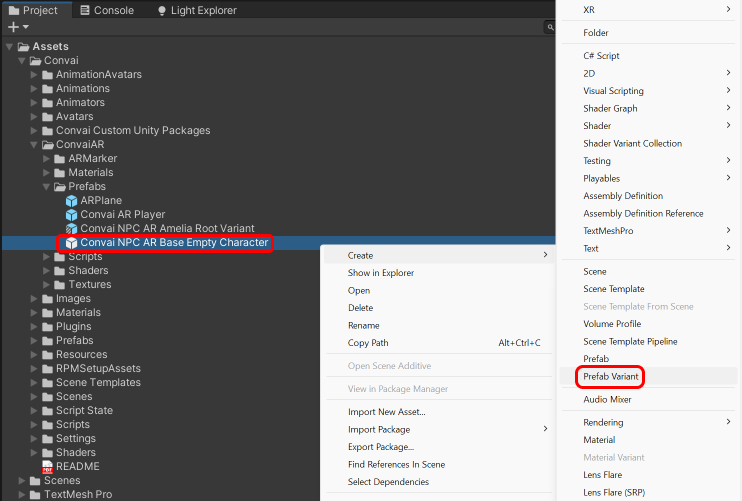 1. Right-click on the " *Convai / ConvaiAR / Prefabs / Convai NPC AR Base Empty Character* " prefab.