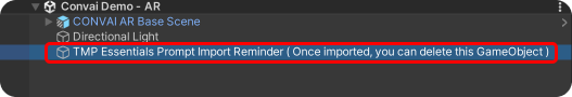 4. Open the " *Convai / Scenes / Convai Demo - AR* " demo scene. If the TMP Importer window appears ( It will appear if TMP Essentials is not installed in your project ), click " **Import TMP Essentials** " to install TextMeshPro Essentials for UI text objects.