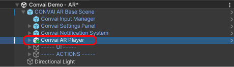 10. Click on the " **Convai AR Player** " object under " **ConvaiAR Base Scene** "