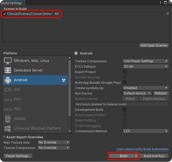 9. Build your project by going to " *File / Build Settings / Build* " Ensure that the " **Convai Demo - AR** " scene is included in the Scenes in **Build** section.