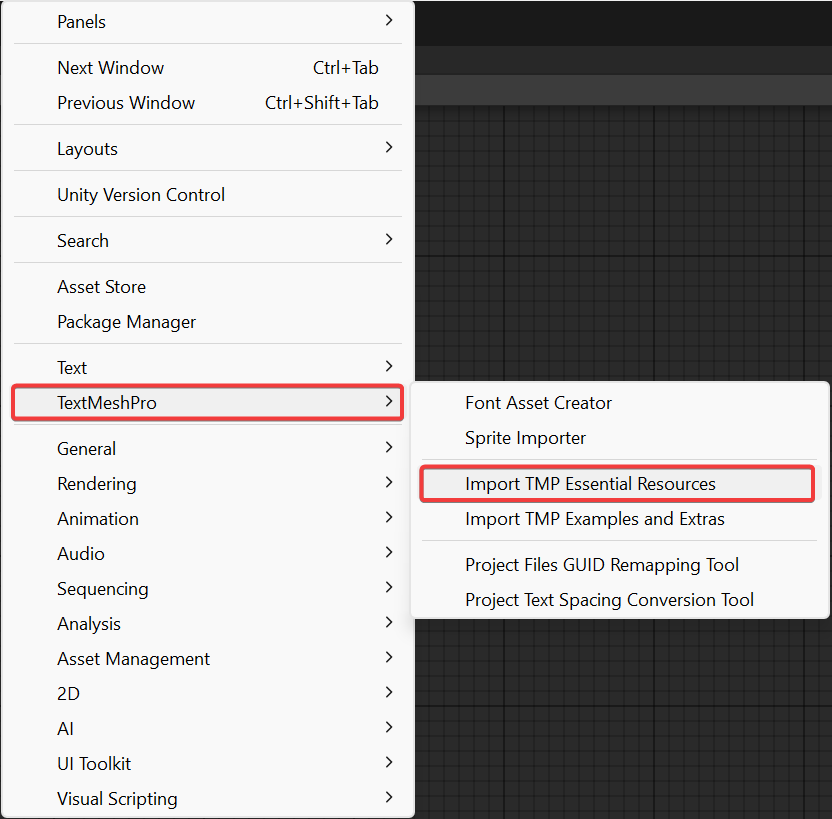 * Go to **Window > TextMeshPro > Import TMP Essential Resources**.