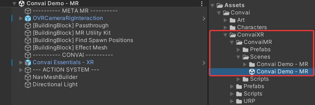 * Navigate to **Assets > Convai > ConvaiXR > ConvaiMR > Scenes** and open **Convai Demo - MR**.