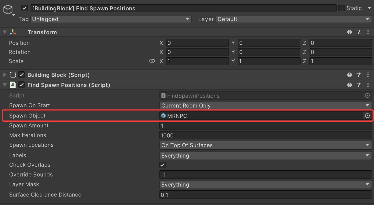 In the demo scene, select **\[BuildingBlock] Find Spawn Positions** in the hierarchy.