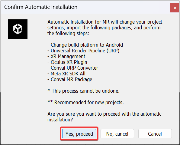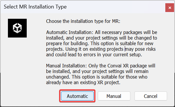 The Automatic Installation method is ideal for users starting new projects who want a straightforward setup. It provides a fully integrated Convai MR project from the beginning, ensuring a smoother development experience.