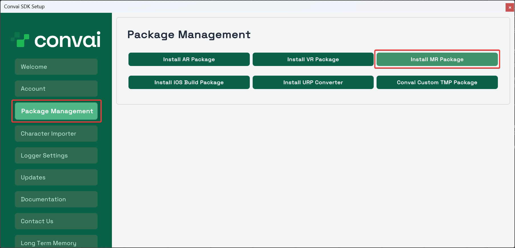 In the Convai Panel that appears, click on **Package Management** and then select **Install MR Package**.