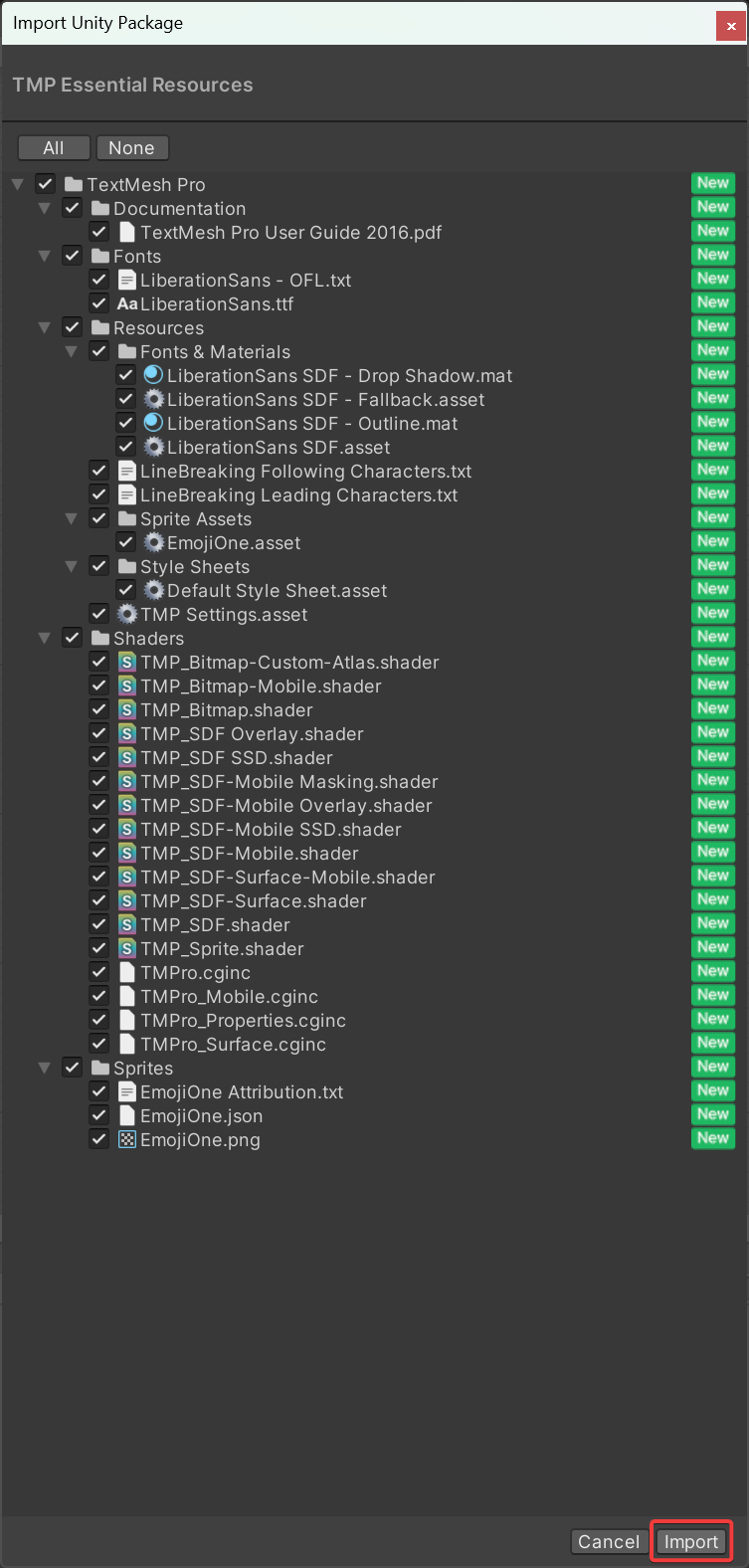 <figure><img src="https://413558230-files.gitbook.io/~/files/v0/b/gitbook-x-prod.appspot.com/o/spaces%2FEtUJA212Zc1S9ACc8T4l%2Fuploads%2FNjSzbmM3OB0cGaHhTHcu%2FTextMeshProInstallation_2.png?alt=media&#x26;token=45acb1f9-afb4-418f-bd81-fda07e38a175" alt="" width="375"><figcaption></figcaption></figure>