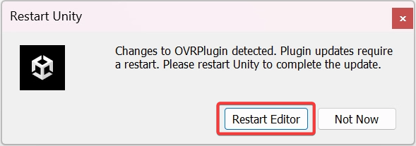 If a prompt titled **OVRPlugin Detected** from MetaSDK appears, click **Restart Editor** to continue.