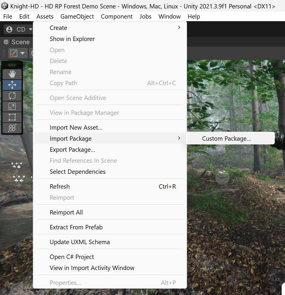 5. &#x20;Select **Assets > Import Package > Custom Package.**<br>