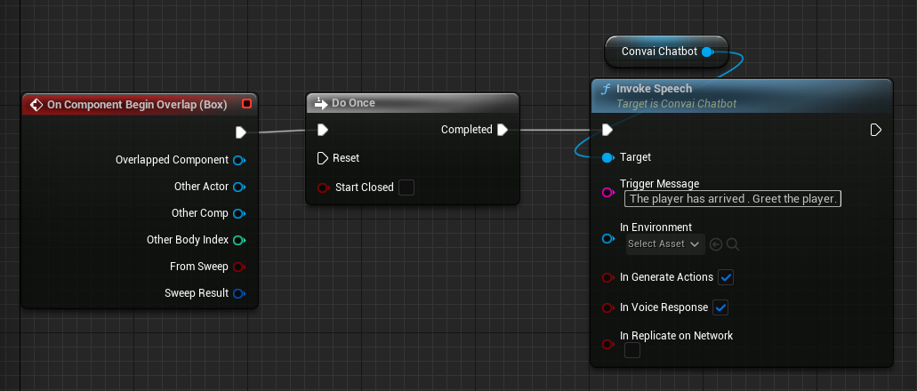 6. Setup the following blueprint schematic which uses the `Invoke Speech` node from the `Convai Chatbot` component.&#x20;
